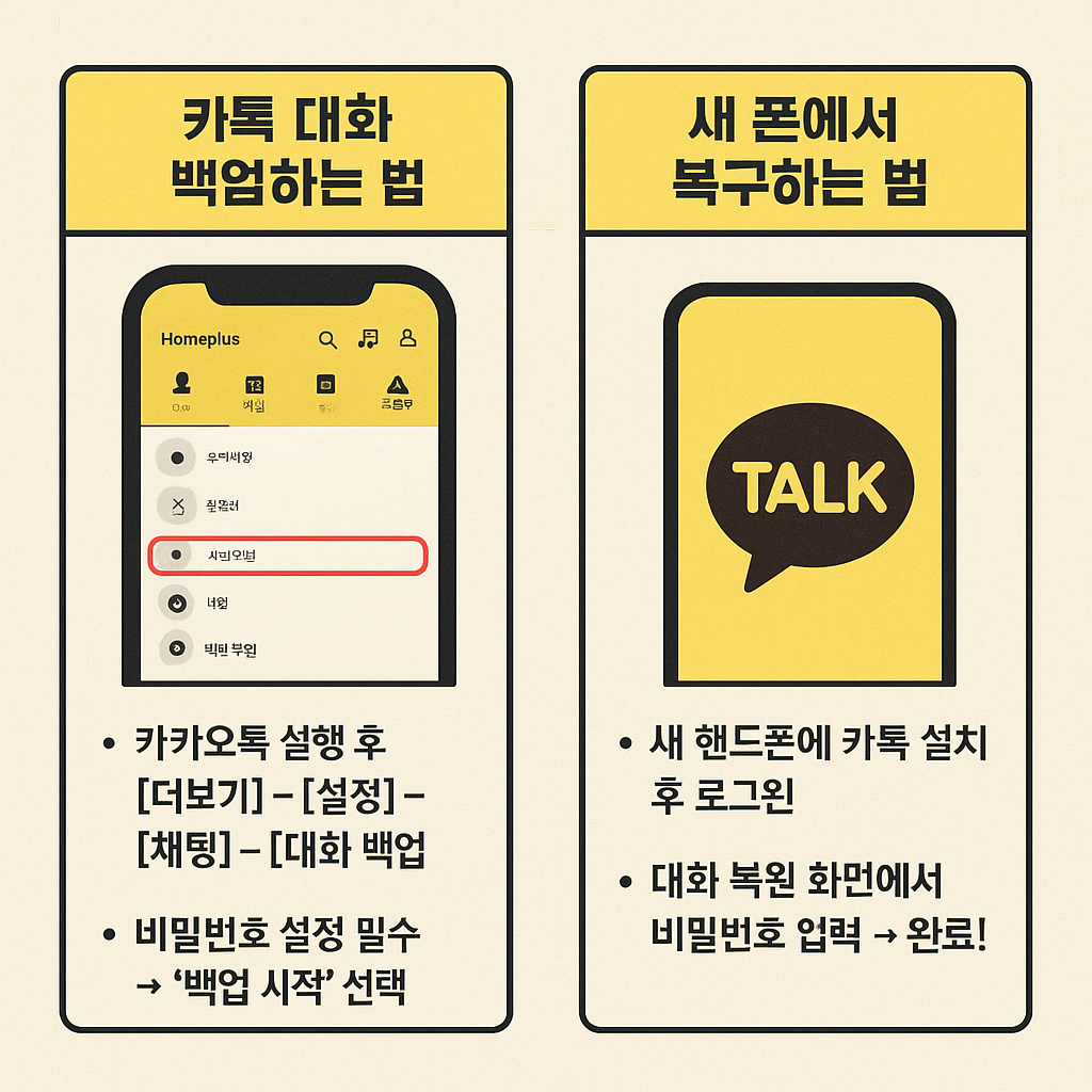 - 새 기기에서 카톡 설치 → 로그인 → 대화 복원 화면에서 비밀번호 입력 → 완료!
